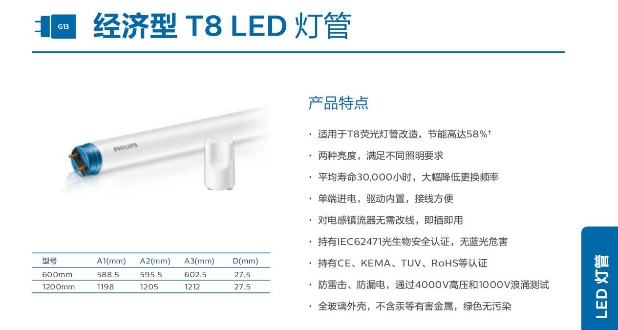 飞利浦单端进电18W/1800LM一体化LED灯管6500K产品特点