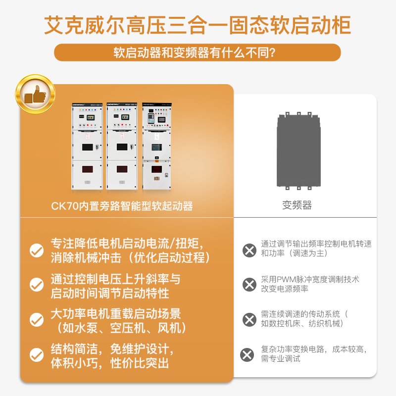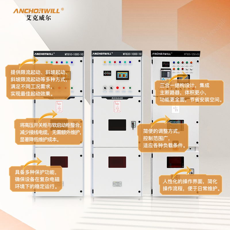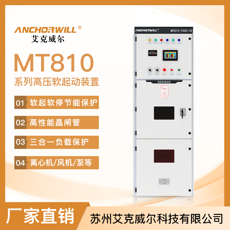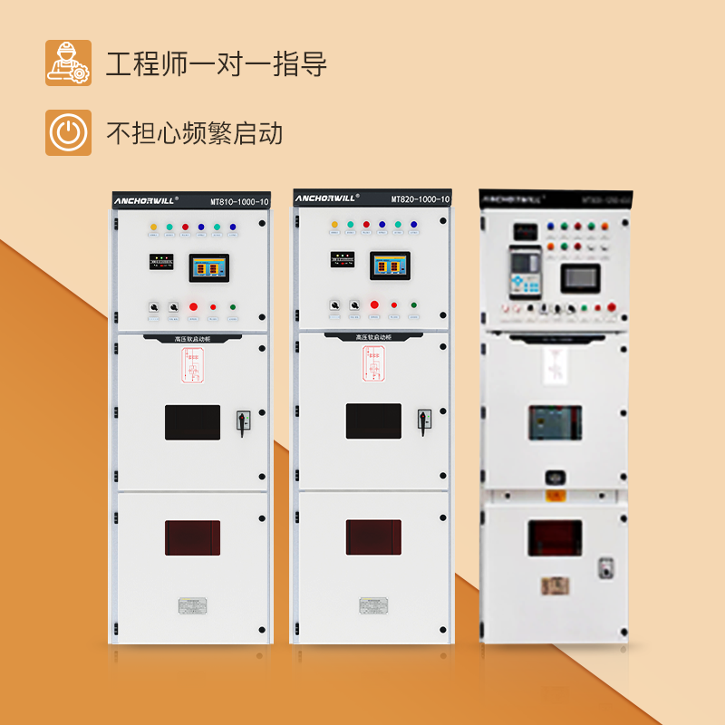 艾克威尔MT830高压软启动装置整体结构被划分为3个相互绝缘的部分。由高压可控硅模块、可控硅保护部件、真空旁路接触器等组成的高压回路;由光纤触发部件、信号采集与保护部件组成的可控硅触发及信号采集与系统保护单元:由系