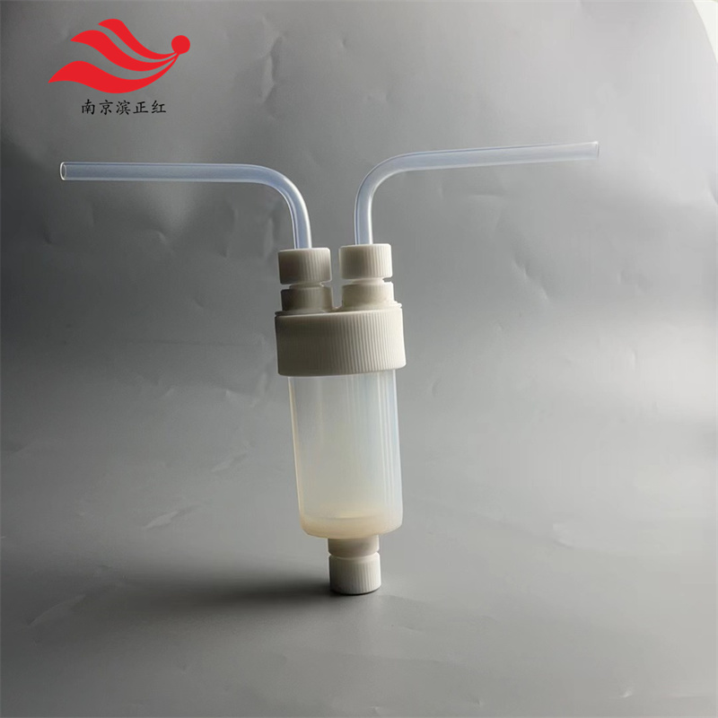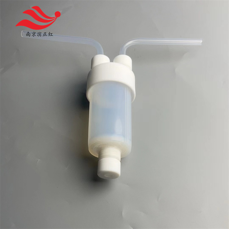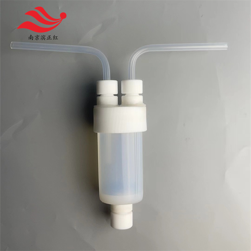 PFA冲击瓶(反应瓶)多用于光电、新材料、新能源、半导体等行业,于进行气体、固体或液体间的反应实验。冲击瓶的顶端的两个接口可接1/4输送管,实现一端进样一端出样的功能。