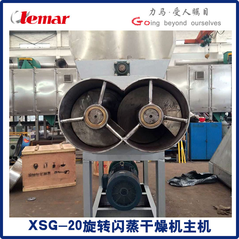 系统在使用前,使用氮气将系统内的空气置换出,使系统内的氧气含量达到溶媒的安全浓度之内。循环氮气经加热设备被加热后进入闪蒸干燥机。湿物料由输送装置进入闪蒸干燥机的螺旋加料机构,螺旋加料器可变频调速。物料经螺旋输送进入干燥破碎室,随即被高速旋转而又具有不同角度的刀片破碎,又被高速进入旋流干燥室的高温气流冲击高速旋转、夹带上升,这时气流温度急速下降,物料中水分迅速蒸发从而完成干燥过程。过大物料被淘析环挡住落到干燥破碎室继续破碎直到获得细粉料。