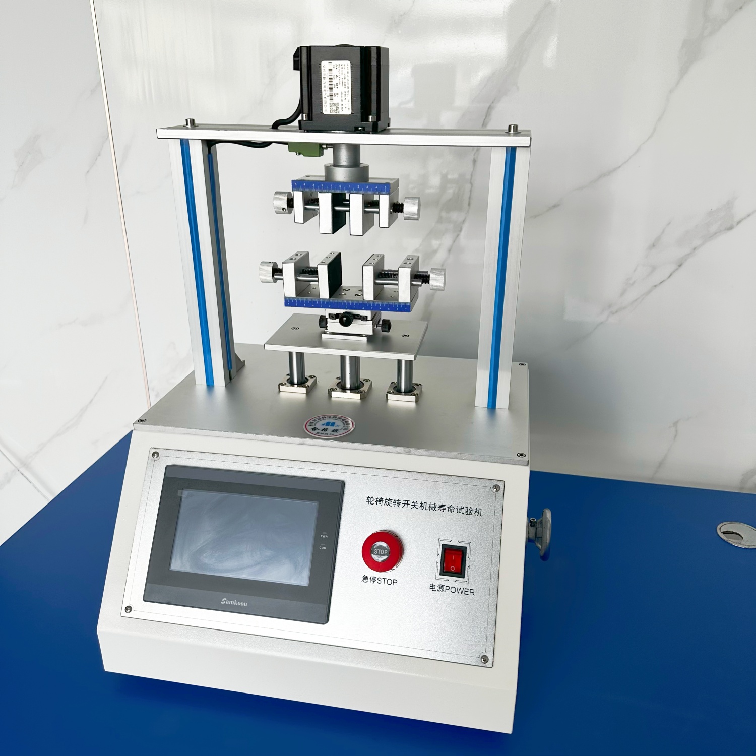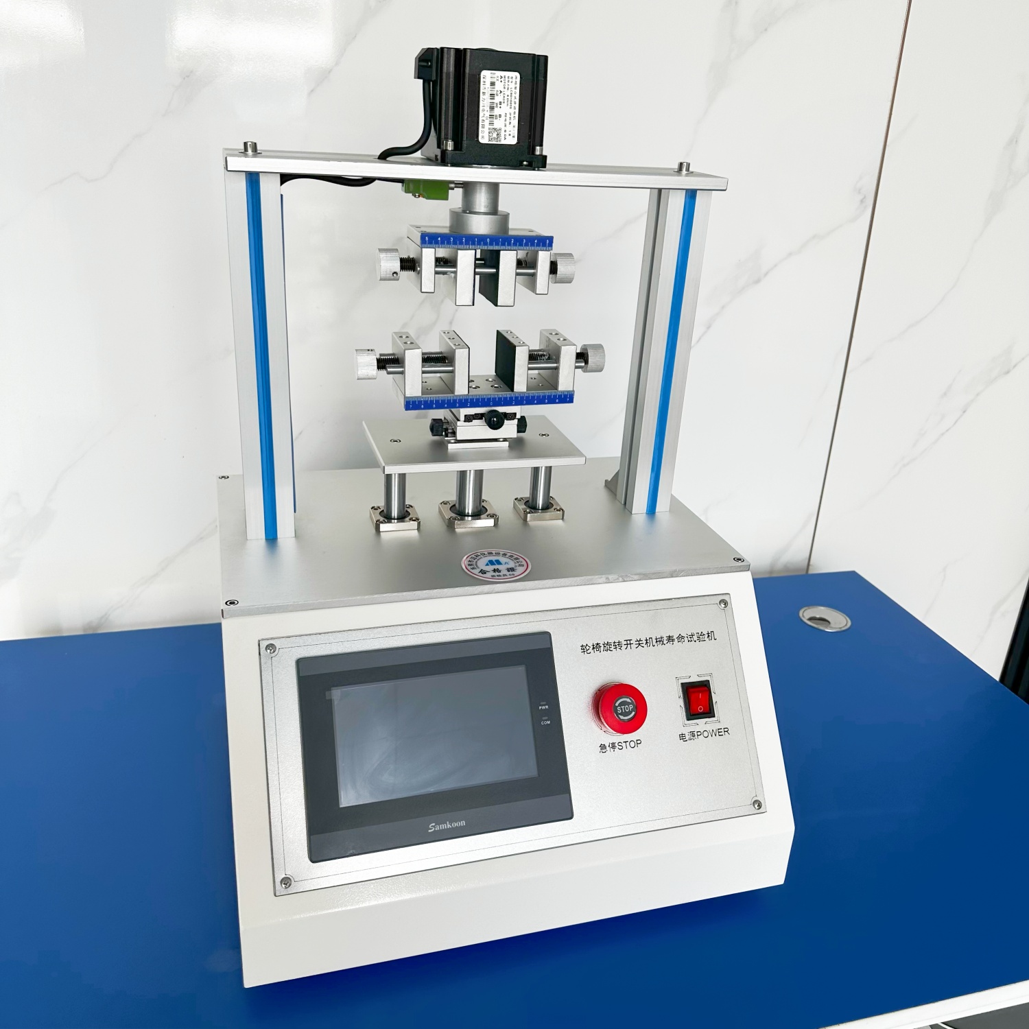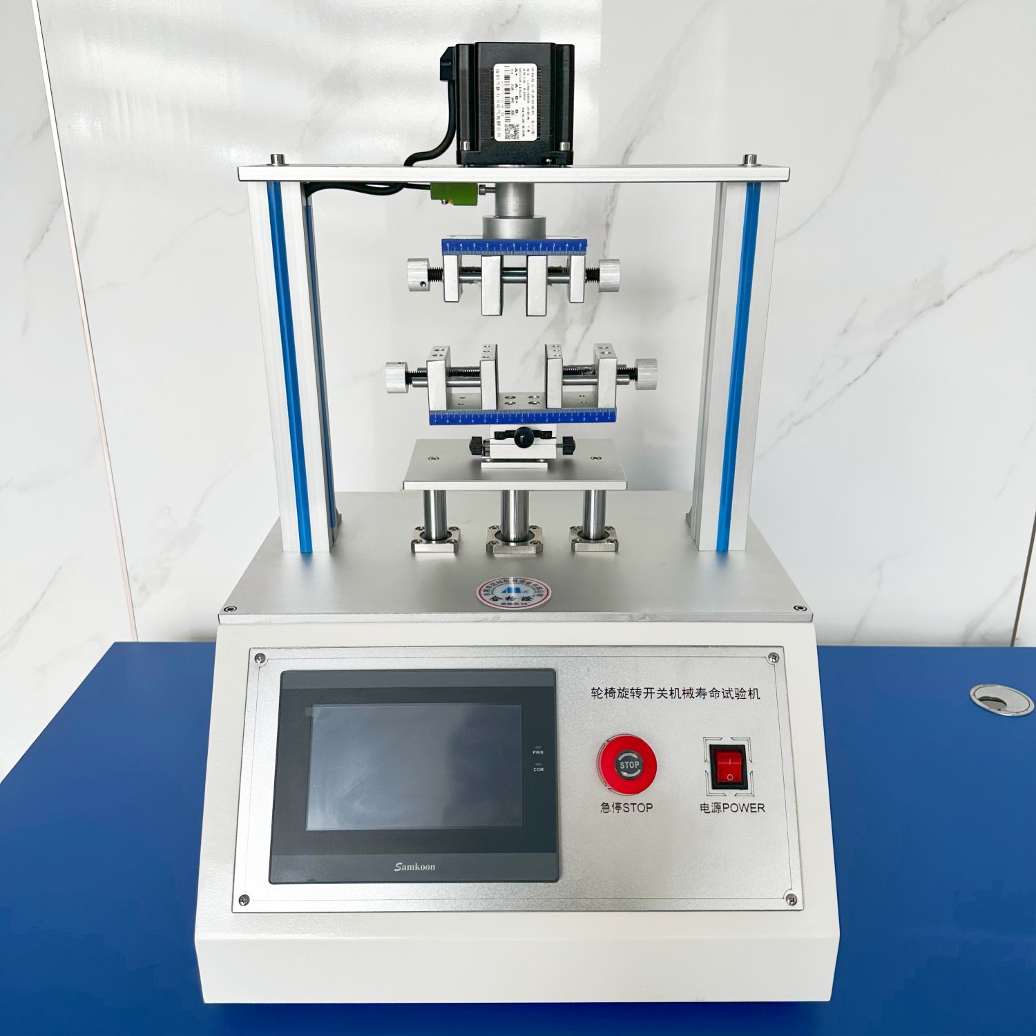 电动轮椅旋转开关寿命试验机用于电动轮椅手柄旋转开关寿命测试。电动轮椅旋转开关寿命试验机采用触摸屏控制设置且显示,旋转治具固定测试产品在一定角度、速度、次数、时间反复循环测试。