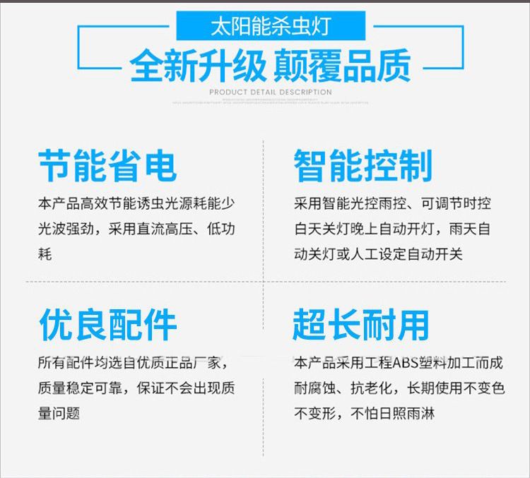 太阳能供电:白天通过光伏板吸收太阳能并储存在蓄电池中,夜晚自动启动,节能环保,无需外接电源。