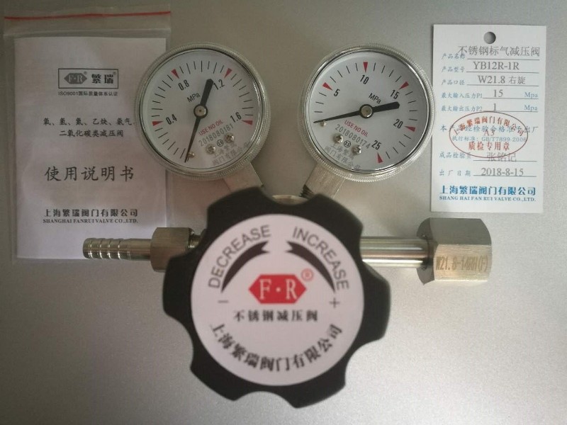 上海繁瑞阀门有限公司*的不锈钢不锈钢标准气体减压阀生产厂家,输出压力稳定,密封性能好,阀体采用不锈钢316L材料,进口处带过滤装置,使用方便经久耐用。阀体采用单级式结构,膜片与母体采用硬密封形式,母体接口螺纹:1/4''NPT(F) ,可接2升、4升、8升、10升标准气体小钢瓶。对应标准气体钢瓶开关接口QF-21A、QF-011外径21.8mm(W21.8-14RH(F)),使用温度:-40℃至74℃,泄漏率:2X10ˉ8atm.cc/sec He,CV值有:0.06、0.08、0.12、0.14、0.15、1.0、1.8、5.2等,母体材料:316L,阀座材料:PCTFE、PTFE、Vespel、Hastelloy,膜片:316L。可用于各种标准气体、混合气、高纯气体、医疗实验、仪表及分析、气相分析、电厂设备、石油化学工业、气体控制箱、吹扫系统、热处理设备、气体汇流排、腐蚀性气体、有毒气体、半导体等行业的气体管路系统。阀体结构轻巧是采用控制阀体内的启闭件的开度来调节介质的流量,将介质的压力降低同时借助阀后压力的作用调节启闭件的开度,使阀后压力保持在一定范围内,特点是在进口压力不断变化的情况下,保持出口压力值在一定的范围内,特点是输出压力可大可小,稳压可靠,安全放心。