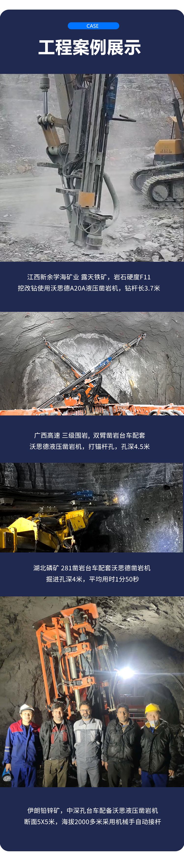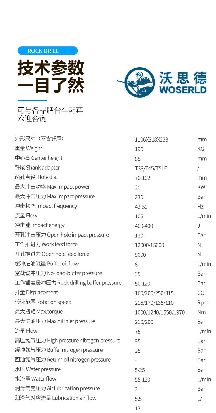 沃思德液压凿岩机A20A是一款专为露天矿山开采设计的设备,冲击功率:20 KW 凿孔直径:76 - 102 mm 流量:105 L/min 外形尺寸:1106318233mm 钎尾:T45/T51/T51E