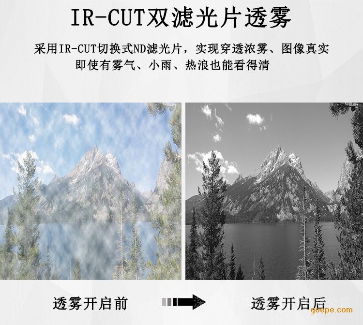| 日夜转换及透雾 | IR-CUT双滤镜透雾 | 具有3波段切换,3种透雾模式 | ||