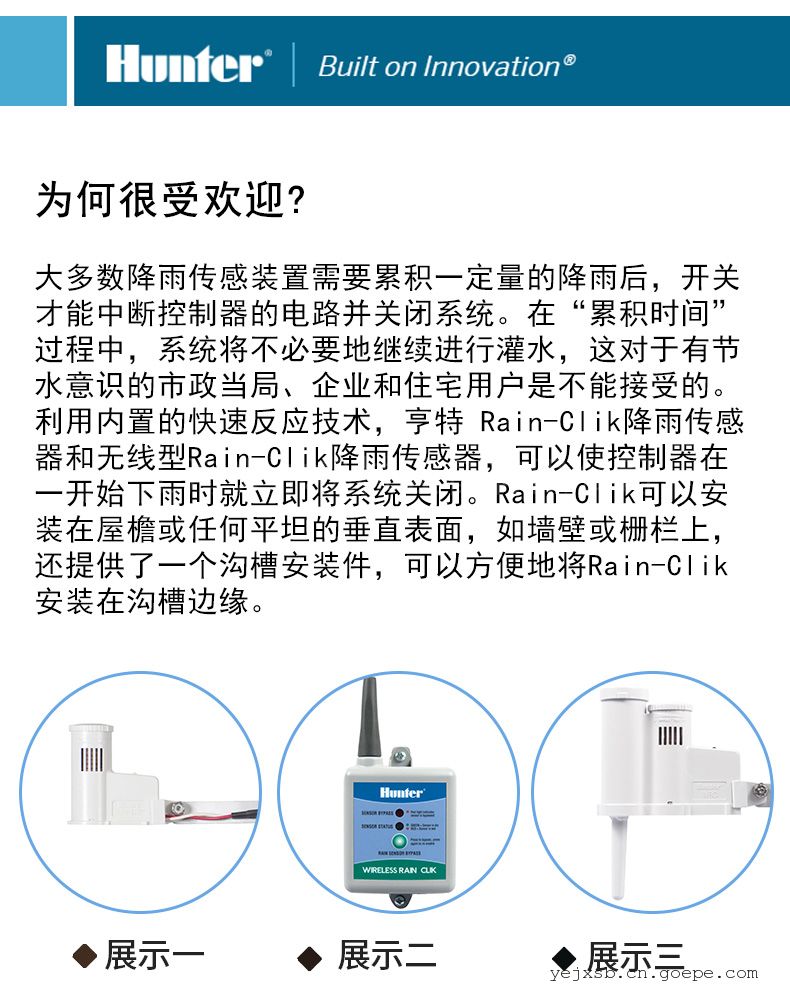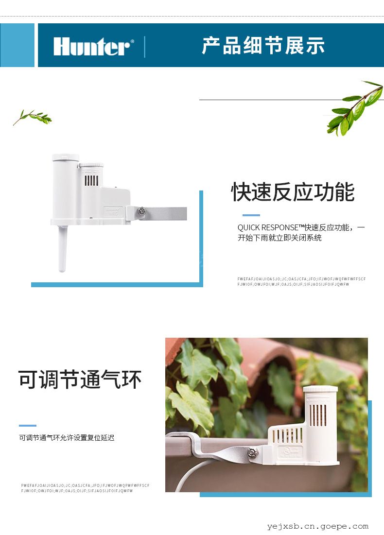 | 详细内容 | 亨特传感器产品特点 具有快速反应特征,反应速度(2-5分钟),无效雨量积累时便可关闭系统; 设置干燥期:根据雨量大小,调整灌溉时间、灌溉量,安装维护方便; 根据土壤条件设置关闭天数(1-3天),可选择不同的安装方式,根据现场施工条件,选择安装在屋檐集雨槽、墙壁或导线管上; 抗紫外线材料,含有2根7.62m#20电线,从安装到改造都很容易; 直接安装,保质期5年; 可选择旁路开关,增强系统可调性 |