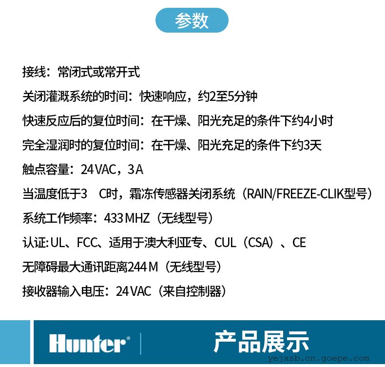 | 参数名称 | 亨特RAIN-CLIK雨水传感器参数标准 |