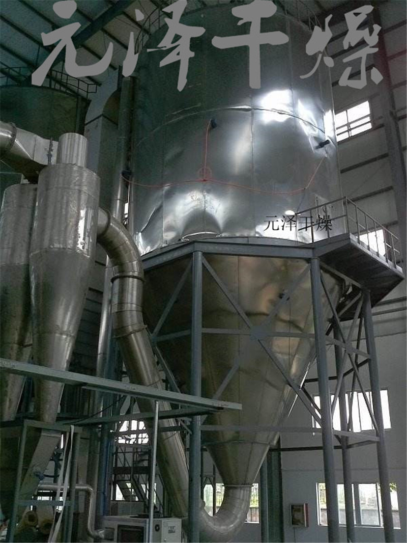 空气经过滤和加热,进入干燥器顶部空气分配器,热空气呈螺旋状均匀地进入干燥室。料液经塔体顶部的高速离心雾化器,(旋转)喷雾成极细微的雾状液珠,与热空气并流接触在极短的时间内可干燥为成品。成品连续地由干燥塔底部和旋风分离器中输出,废气由风
